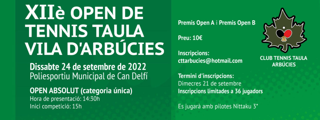 XIIè Open de Tennis Taula Vila d’Arbúcies Dissabte 24 de setembre 2022. Queden obertes les inscripcions, recordar-vos que les places